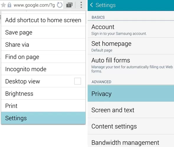 cookies and cache in samsung internet